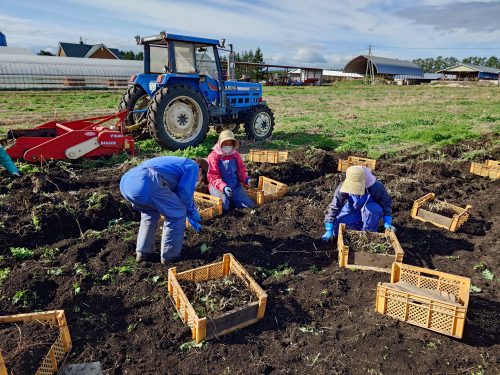 8月25日、馬鈴薯(品種男爵)の収穫が始まる。広島の公立大学生3人が参加してインターンシップも始まった。澤田先生のゼミからは昨年から続いて参加していただいた。ワーキングホリデー7人の外国人とともに農作業に勤しんでもらい、内容の濃い忘れられない経験をしてもらう。