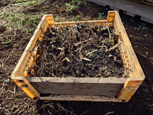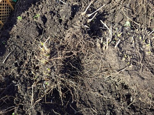 昨年10月に伏せ込んでいた行者にんにく(ヒトビロ、アイヌネギなどとも呼ばれる)を掘り出しています。土やバーク堆肥がまぶしてあるのでほろいながら移設する。