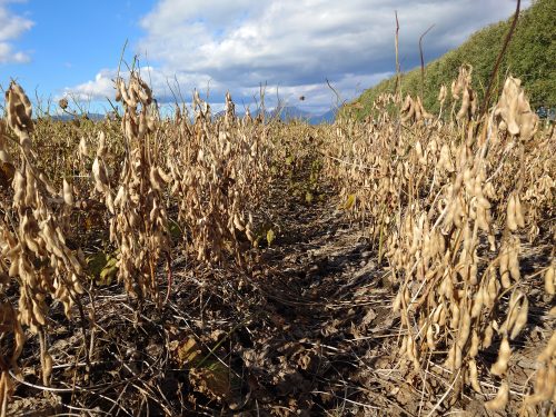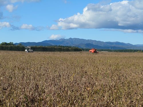 最高気温26℃と暖かいなか不作の小豆の収穫終えると、すぐ豊作の大豆の収穫を始める。まだ子実水分が高めで一時中断することにした。収量は昨年並みの360kg/10アールあたりを見込んでいる。昨年を上回る可能性もある。豊作です。