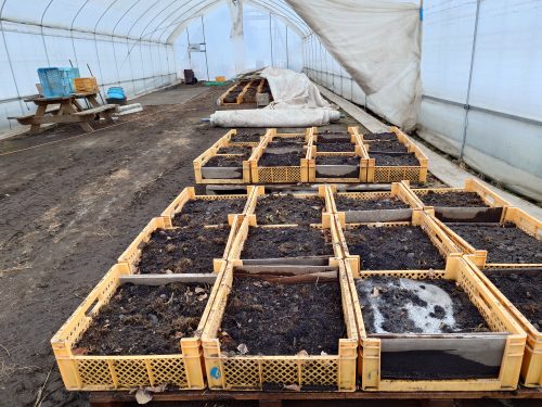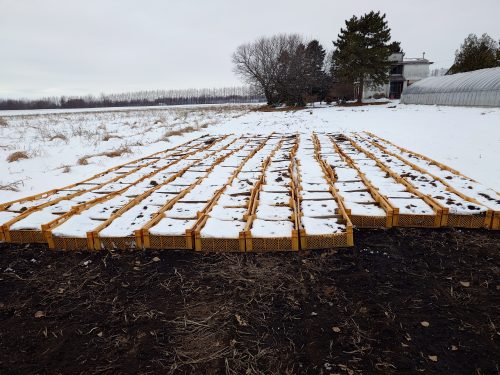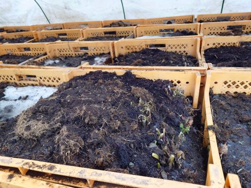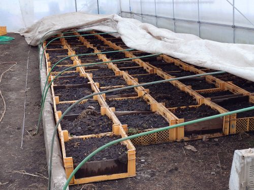 昨年10月に収穫して屋外に設置していた『行者ニンニク』をビニールハウスに搬入する。カチカチに凍結していてゆっくり解凍していく。2月5日前後に出荷時期を迎える。南(沖縄県)のはじから北のはじまでスタミナ山菜を届けます。