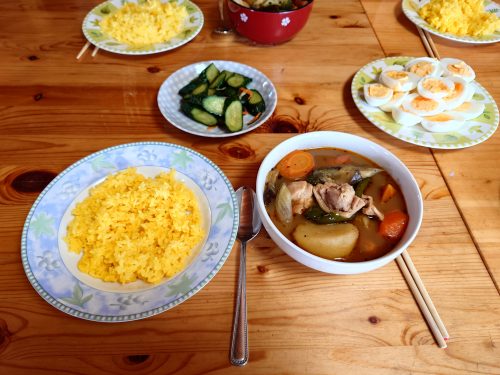 二日間あるので昼食は職員、ワーキングホリデーの外国人と一緒に、1日目自家産野菜使用のスープカリー、2日目は残ったスープを利用して鹿追産豚肉を使用したカツカレーを楽しく?食べていただいた。