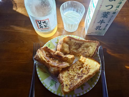 今朝は無性に『フレンチトースト』が食べたくなって調理する。トーストをじっくり見つめて原材料が地元産であることを認識する。小麦粉、牛乳、バター、卵、ビート糖、蜂蜜は我が家で採れたものを三重県の業者さんから頂いた。見事に全部が鹿追産と言える。北海道ならどこでも条件は同じであろう。
