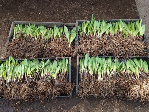 昨年10月に伏せ込んでいた行者にんにく(ヒトビロ、アイヌネギなどとも呼ばれる)を掘り出しています。土やバーク堆肥がまぶしてあるのでほろいながら移設する。