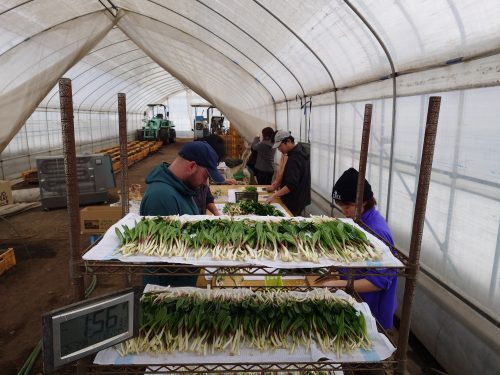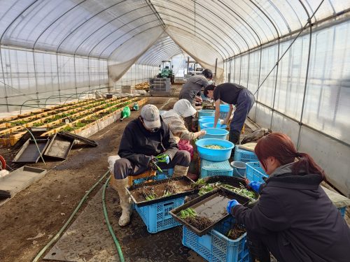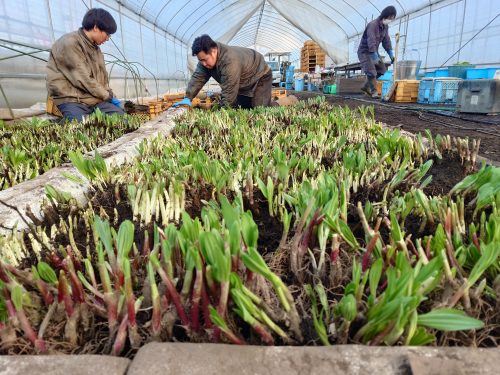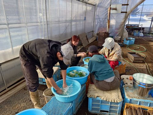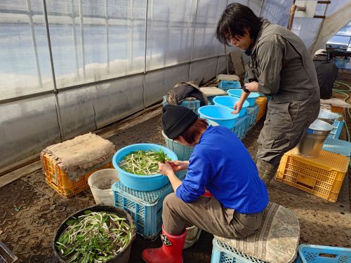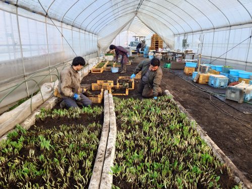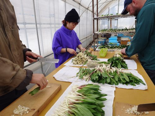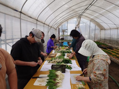 外はー20度Cのなか今年度の行者にんにくの出荷がはじまる。ビニールハウスの内部は2重にビニールが施工されており温暖で快適に作業ができる。日中になると30度を超え外気を入れないと暑くなり過ぎる。