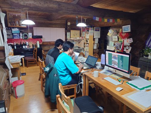 然別湖ネイチャーセンターのスタッフと夕方6時過ぎまで作業を頑張った。一日で天井部分を残してこんなに制作をする。CとMと私3人と台湾から参加のボランティア2人が屋根を制作している4〜5人の男性スタッフにシャーベットを投げ渡す担当を受け持つ。我々の頃は設計図もなく製作者の感性であ〜でもないこ〜でもないとこしらえたものだが、今は寸法も取りあらゆる面でこだわりを持っている。建物も規模も大型化しているのできちんと設計しないと危険かもしれない。