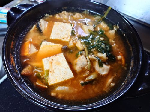 行者ニンニクの強烈キムチ鍋、トマトスープパスタと天ぷら