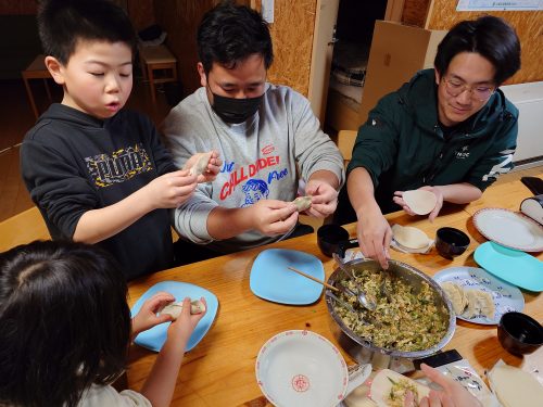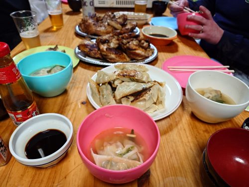 全員が揃うまでせっせと200個ほど作り、水餃子と焼き餃子にして味わう。行者ニンニクはたっぷり使用するので、ニラ、ニンニクは使用していないが口の中はニラとニンニクの合わさった匂いで充満する。美味しいですよ〜。元気が出ます。