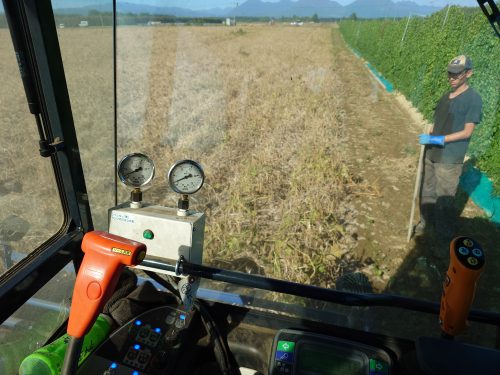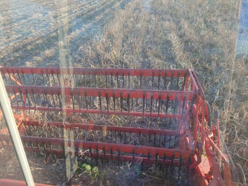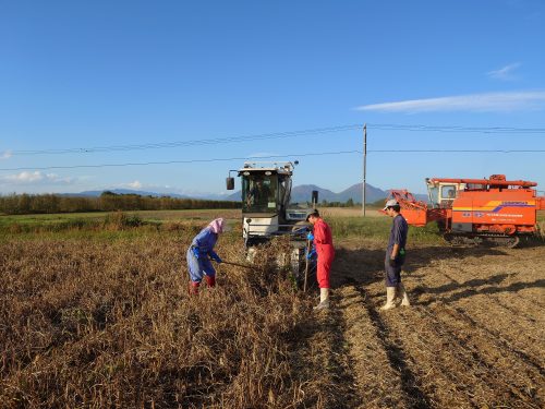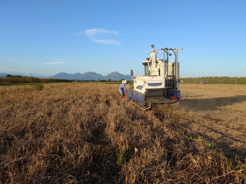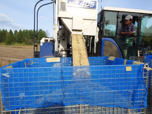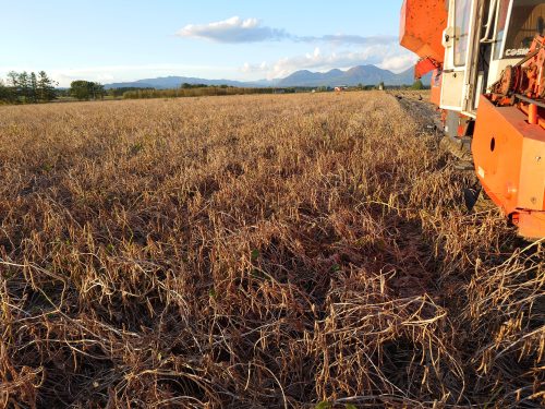 最高気温26℃と暖かいなか不作の小豆の収穫終えると、すぐ豊作の大豆の収穫を始める。まだ子実水分が高めで一時中断することにした。収量は昨年並みの360kg/10アールあたりを見込んでいる。昨年を上回る可能性もある。豊作です。