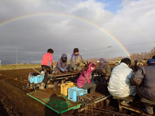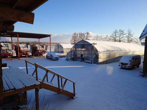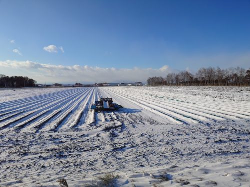 今日は最低気温ー4℃、最高気温4℃と少し寒いのと、雪が解けるとトラクターが滑り前に前進が出来ないため休みとした。十勝では山麓地帯だけの積雪であると思う。